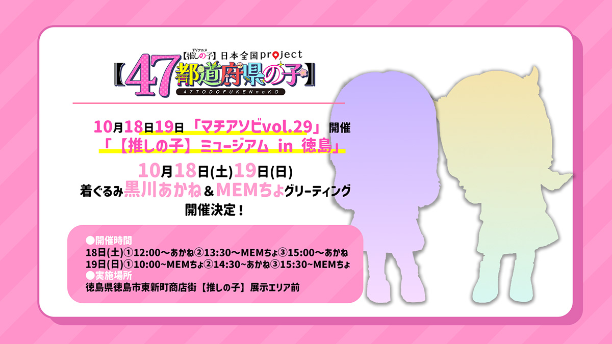 10月18日(土)19日(日)徳島県徳島市にて開催される「マチアソビVol.29」にTVアニメ【推しの子】の出展が決定!キャスト登壇ステージの実施に加えて、等身大フィギュアなどの展示を行うミュージアム展示や物販も開催!着ぐるみグリーティングも実施予定!皆様のお越しをお待ちしております!