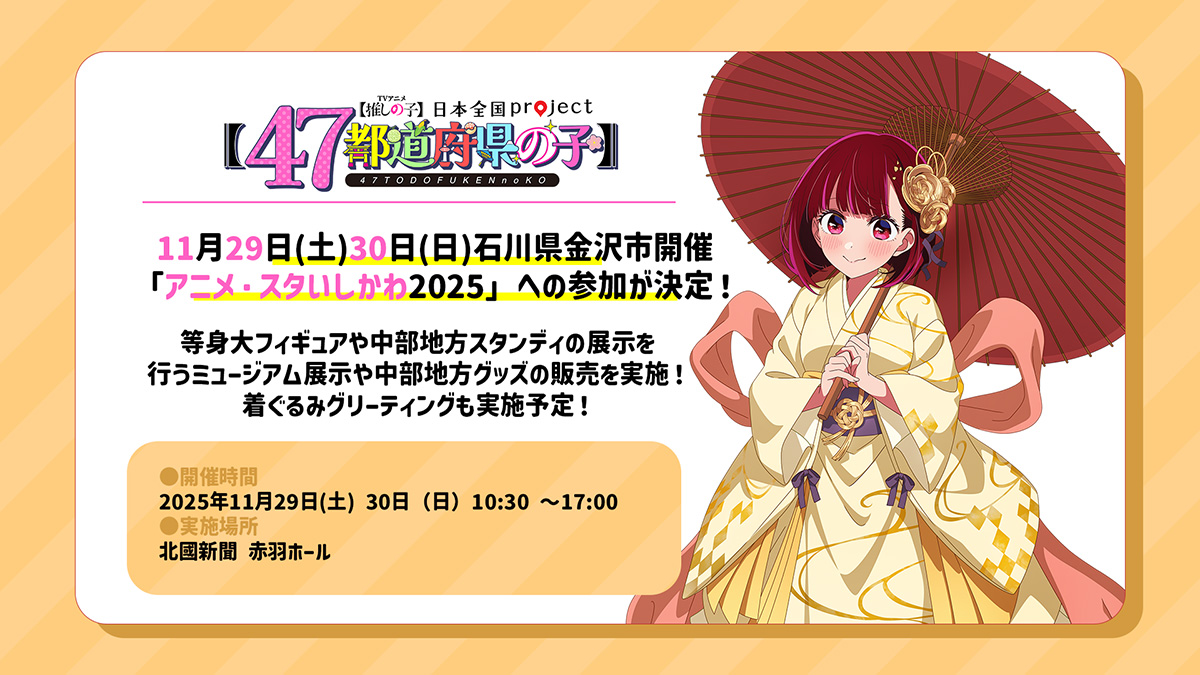 11月29日(土)30日(日)石川県金沢市にて開催される「アニメ・スタいしかわ2025」にTVアニメ【推しの子】の出展が決定!等身大フィギュアなどの展示を行うミュージアム展示や物販も開催!着ぐるみグリーティングも実施予定!皆様のお越しをお待ちしております!